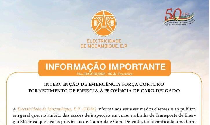 A Electricidade de Moçambique (EDM) anunciou a interrupção temporária do fornecimento de energia eléctrica na província de Cabo Delgado, esta sexta-feira, 06 de Fevereiro de 2026, devido a uma intervenção de emergência numa linha de transporte de energia em alta tensão.