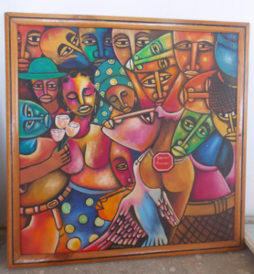 No quadro pode se comtemplar um homem que oferece flores à uma mocinha. O mesmo usando o luxo de sedução fecha os olhos e questiona-se. ‘’Quando será a minha vez de casamento?’’ O rosto nu é uma ironia que quer dizer o corpo despido é privacidade entre o homem e a mulher’’.