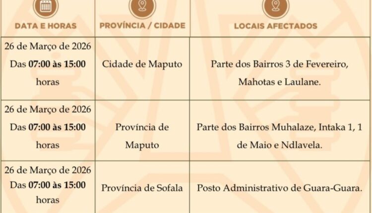 No mesmo horário, na província de Sofala, o corte afectará o posto administrativo de Guara-Guara.
