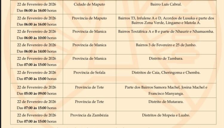 Os horários exactos e as áreas específicas abrangidas pelos cortes estão disponíveis nos canais oficiais da EDM, através de imagem informativa partilhada pela empresa.