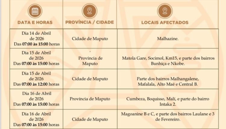 Já na quinta-feira (16), também entre as 07h00 e as 15h00, os cortes irão ocorrer nas zonas de Cumbeza, Boquisso, Malí e parte do bairro Intaka 2, na província de Maputo. No mesmo período, na cidade de Maputo, serão abrangidos os bairros Magoanine B e C, bem como partes de Laulane e 3 de Fevereiro.