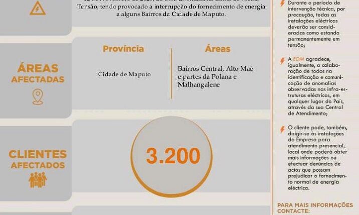 Uma avaria na Linha de Média Tensão deixou, na tarde desta quarta-feira, mais de 3.200 clientes sem energia eléctrica em várias zonas da Cidade de Maputo, incluindo os bairros Central, Alto Maé, partes da Polana e de Malhangalane.