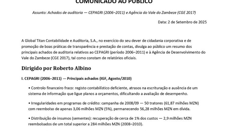 Há irregularidades financeiras detectadas durante auditorias ao Centro de Promoção da Agricultura, CEPAGRI, e à Agência de Desenvolvimento do Vale do Zambeze, durante os mandatos do actual ministro da Agricultura, Ambiente e Pescas. Apesar das anomalias verificadas, a nomeação de Roberto Albino para o pelouro que dirige, equipara-se a um prémio, segundo a Global Titan Contabilidade e Auditoria.